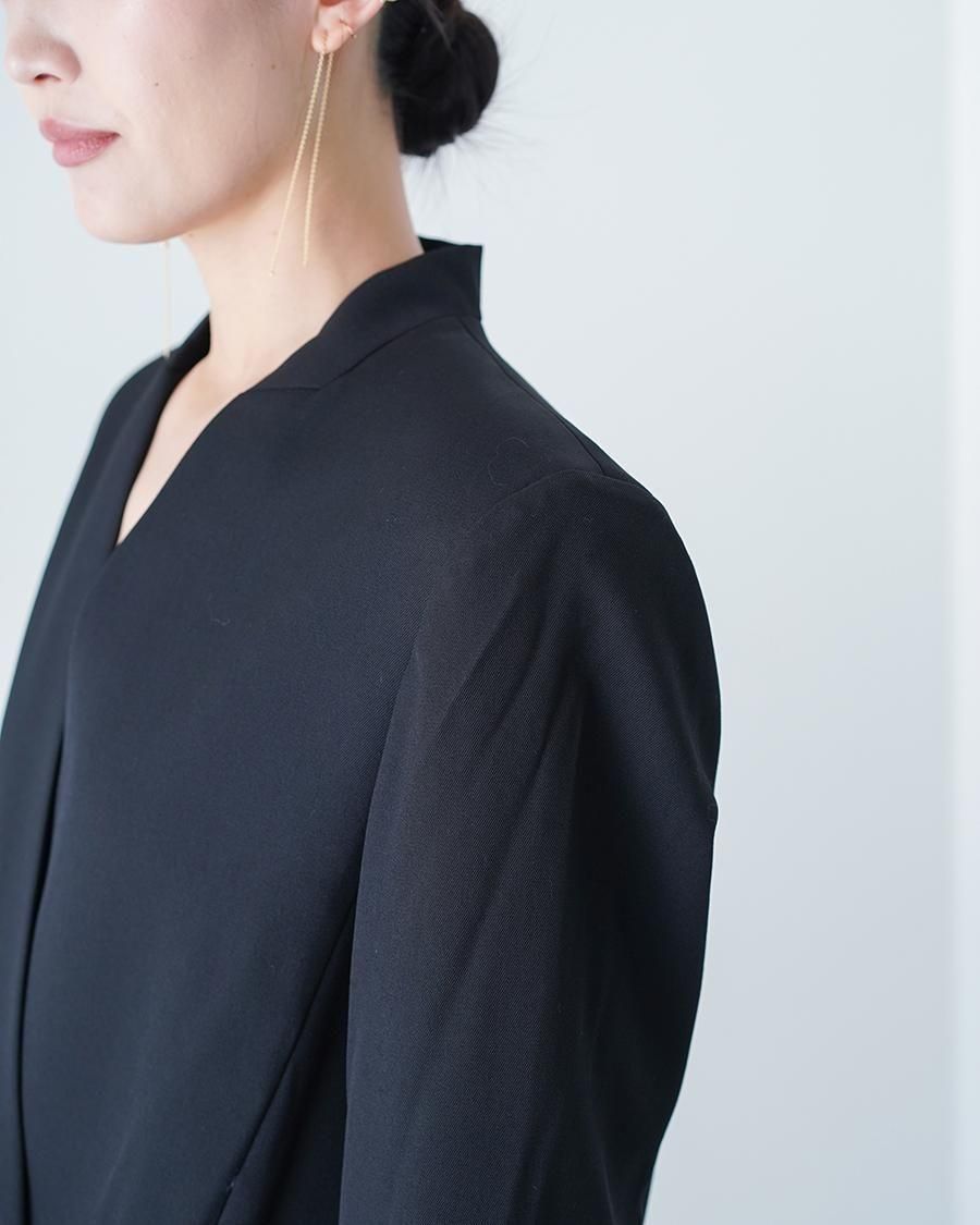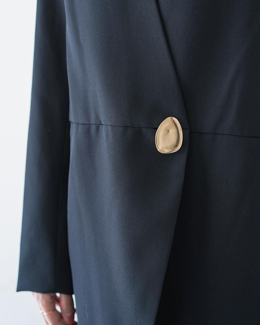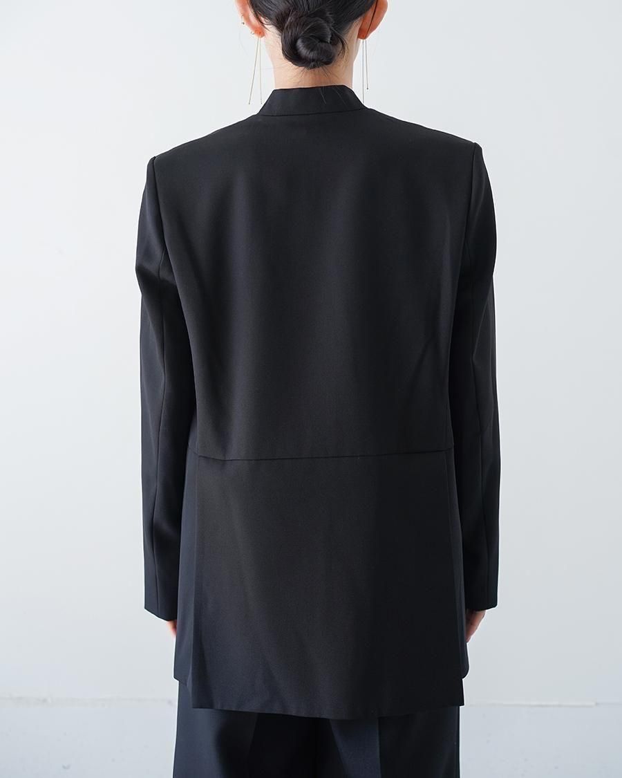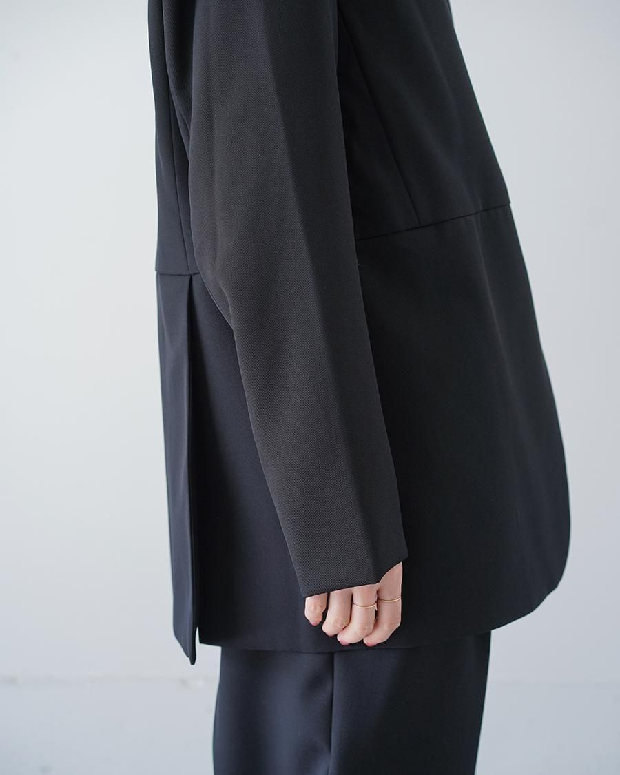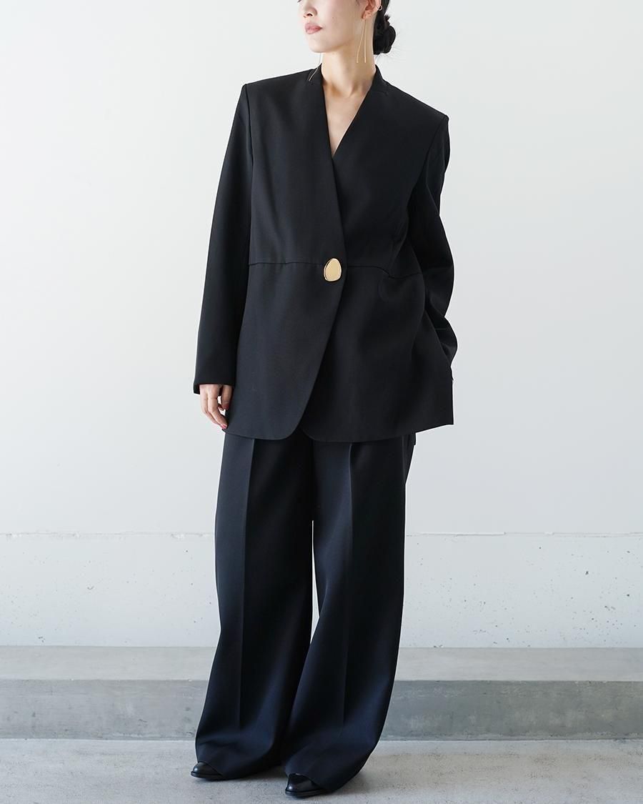 HARUNOBUMURATA(ハルノブムラタ)秋冬新作コレクションより、ブランドのエッセンシャルアイテムとして提案される、ミニマルなカラーレスジャケットのご紹介です。新素材として新たにアップデートされた、滑らかで上品な光沢をもつウール素材を採用した一枚。イタリア製のプレートボタンが、ジュエリーのようなアクセントとしてミニマルな構築美を際立たせます。同素材とのパンツとのセットアップではフォーマルに、単品ではカジュアルなボトムスとも好相性で、幅広いスタイリングに対応します。