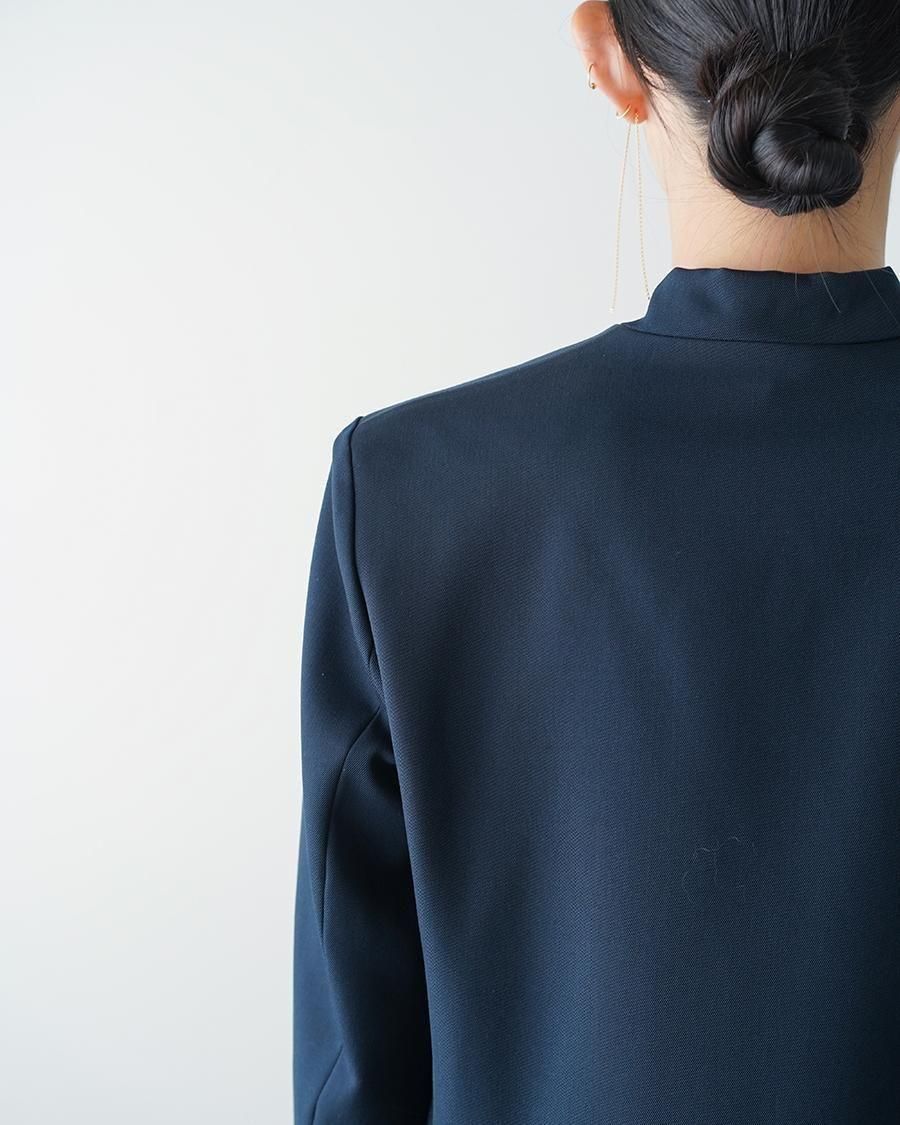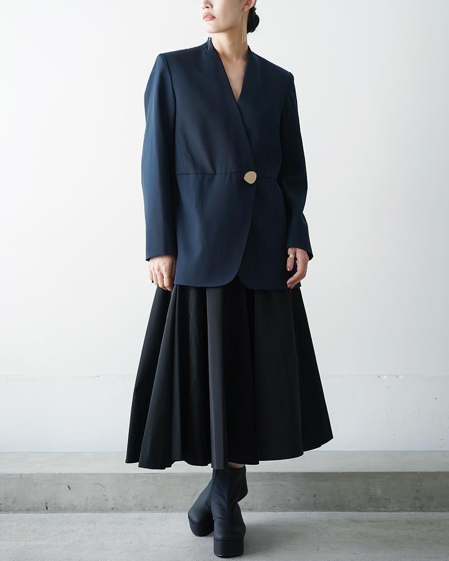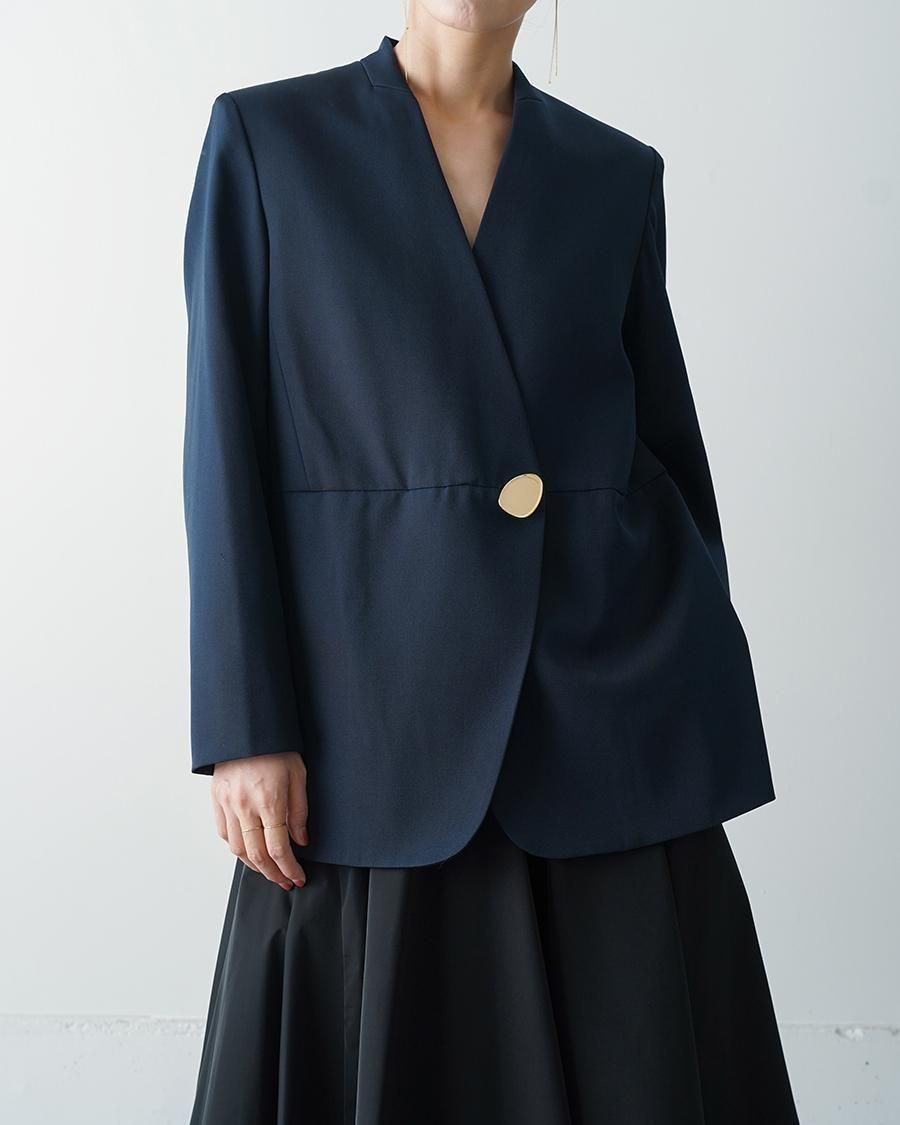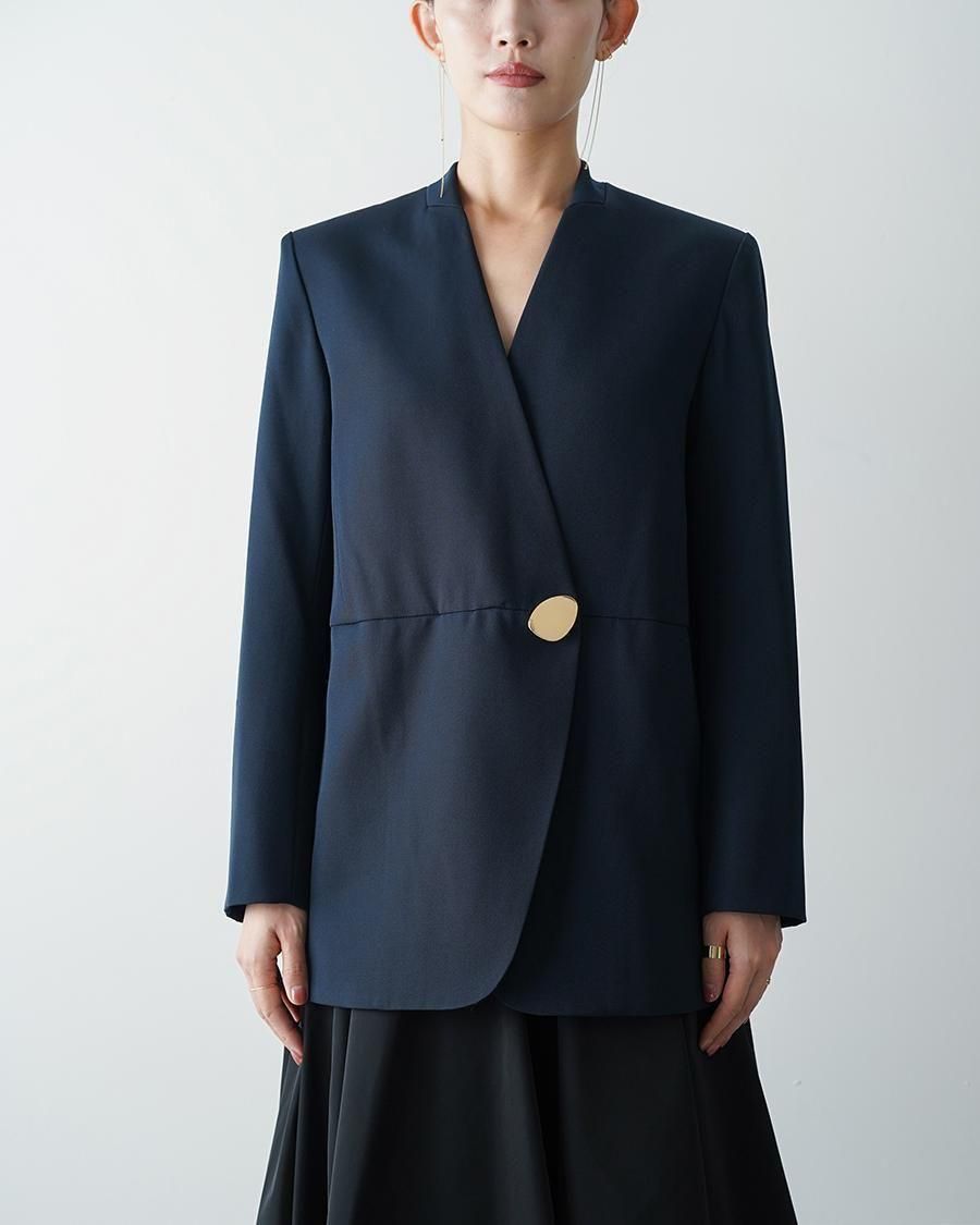 HARUNOBUMURATA(ハルノブムラタ)秋冬新作コレクションより、ブランドのエッセンシャルアイテムとして提案される、ミニマルなカラーレスジャケットのご紹介です。新素材として新たにアップデートされた、滑らかで上品な光沢をもつウール素材を採用した一枚。イタリア製のプレートボタンが、ジュエリーのようなアクセントとしてミニマルな構築美を際立たせます。同素材とのパンツとのセットアップではフォーマルに、単品ではカジュアルなボトムスとも好相性で、幅広いスタイリングに対応します。