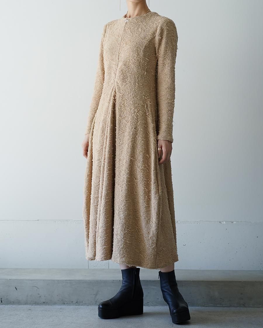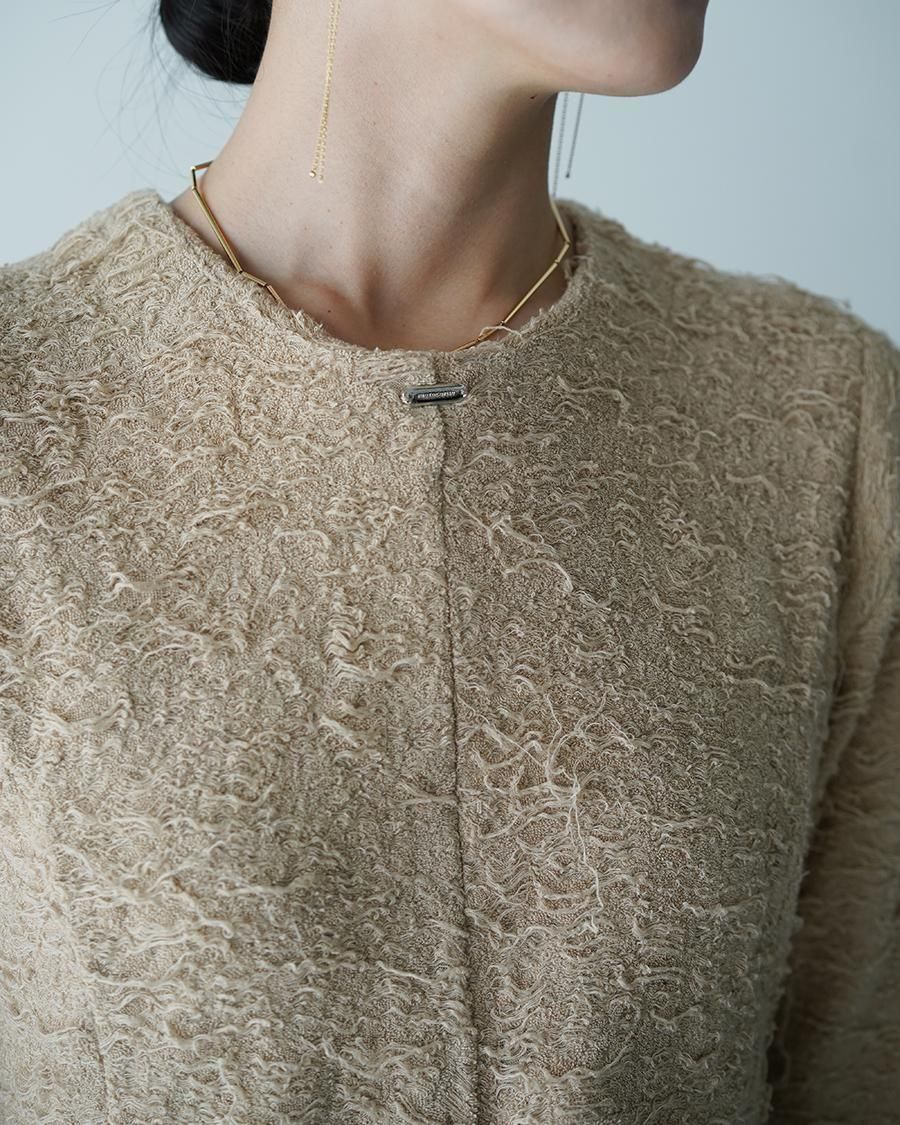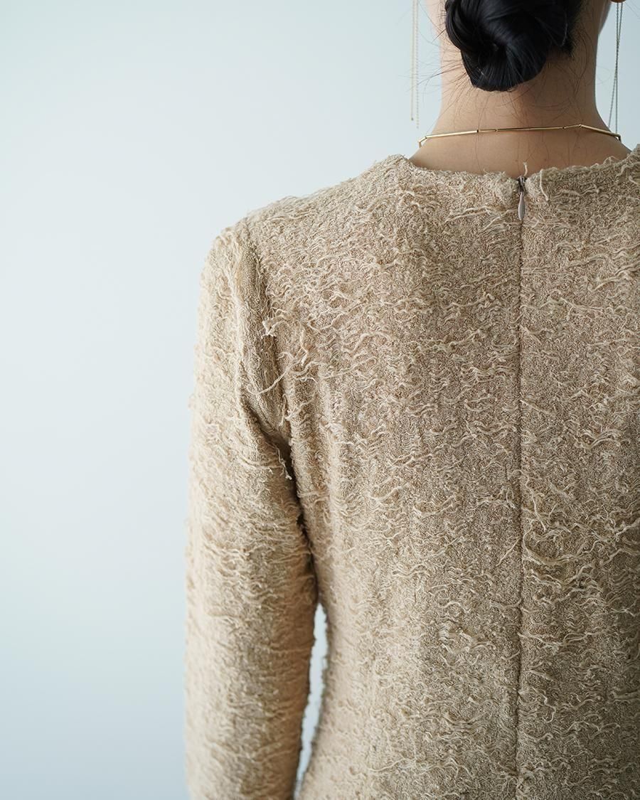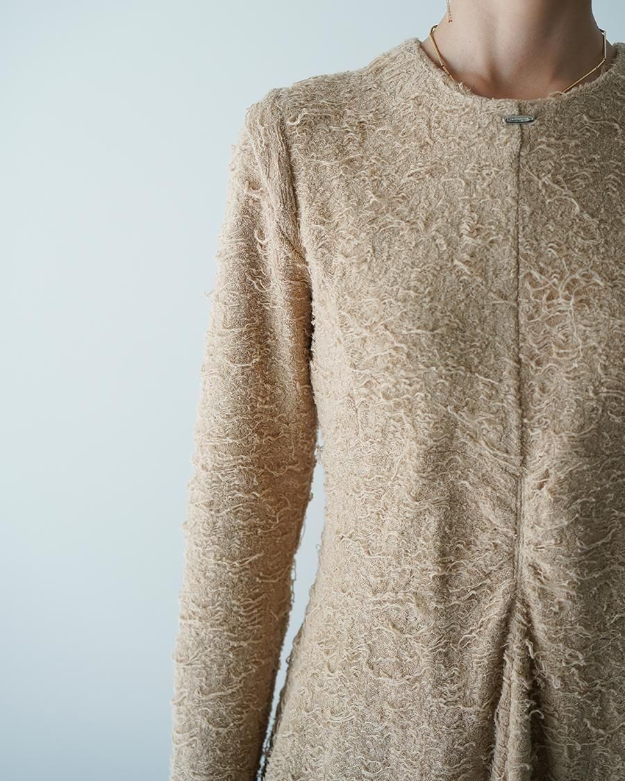 ジャガードで生地の糸を飛ばし、ブロークンファブリックに見せた裏毛生地。見返し仕立てできちんと仕立てたツイードのドレスのような佇まい。タイトなサイズ感とスカートのコクーン&フレアミックスのシルエットがモダンな雰囲気に。楽な着心地に加え、ブランドらしいパターンで一枚でしっかりと決まる唯一無二な一着です。