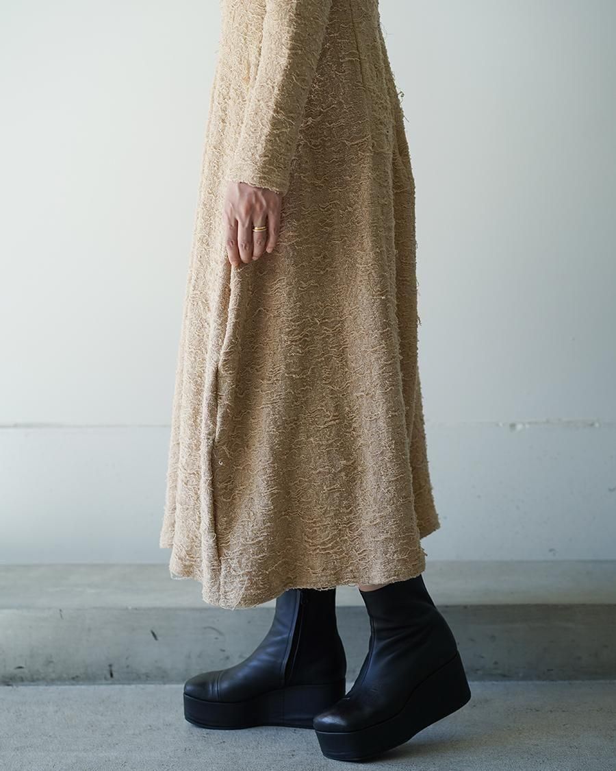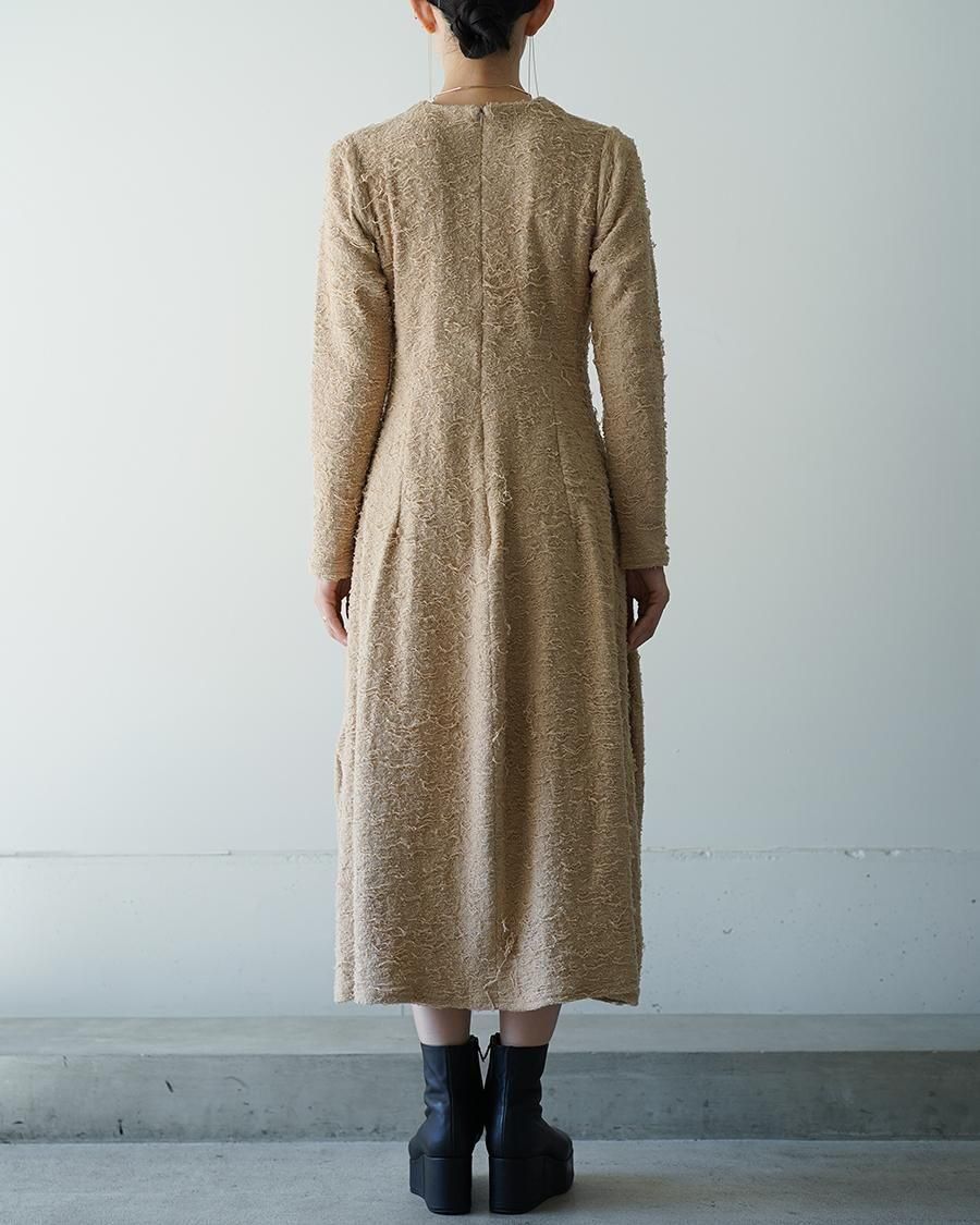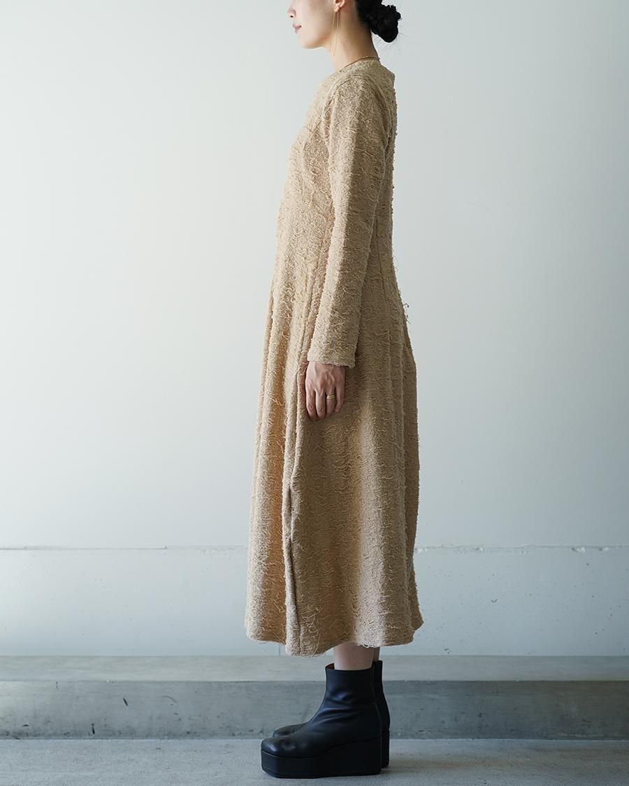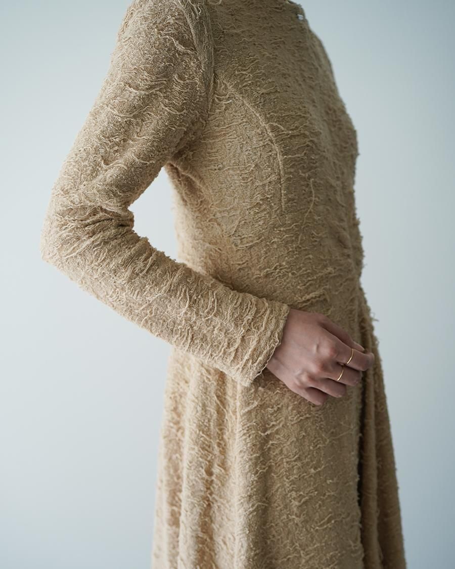 ジャガードで生地の糸を飛ばし、ブロークンファブリックに見せた裏毛生地。見返し仕立てできちんと仕立てたツイードのドレスのような佇まい。タイトなサイズ感とスカートのコクーン&フレアミックスのシルエットがモダンな雰囲気に。楽な着心地に加え、ブランドらしいパターンで一枚でしっかりと決まる唯一無二な一着です。